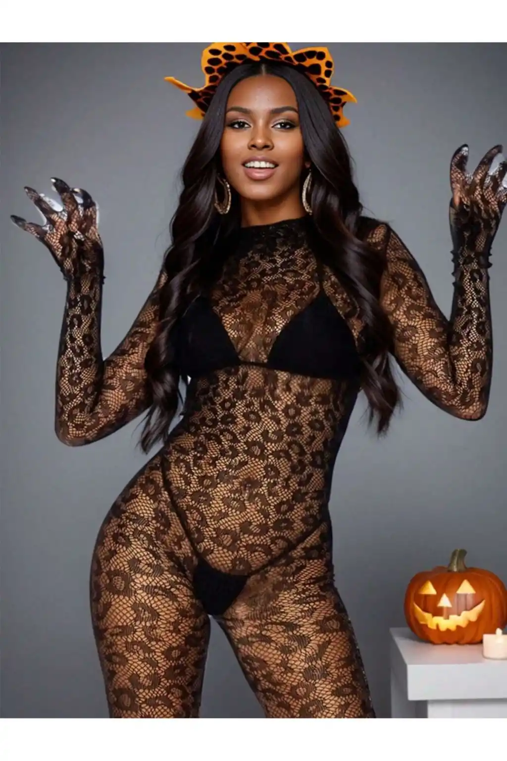 Kadın Seksi Leopar Desenli Transparan File Tulum Uzun Kollu Eldivenli Büyük Beden Vücut Çorabı