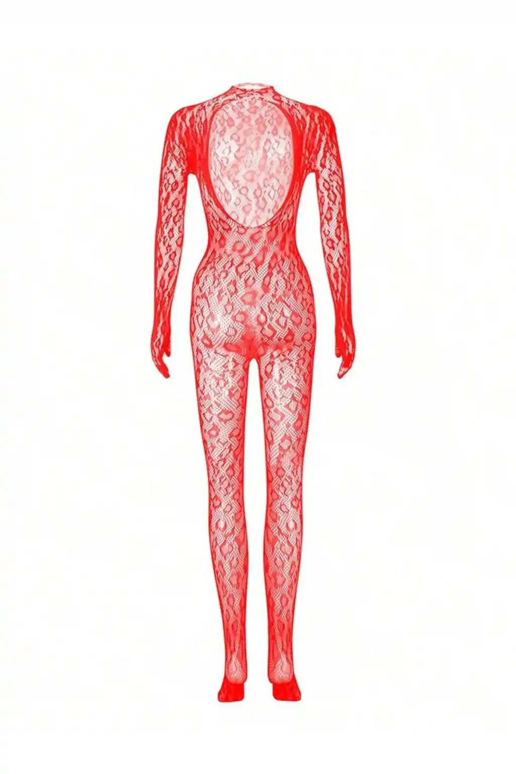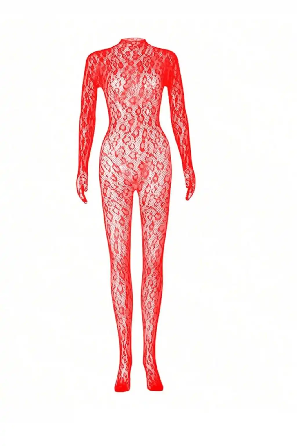 Kadın Seksi Leopar Desenli Transparan File Tulum Uzun Kollu Eldivenli Büyük Beden Vücut Çorabı